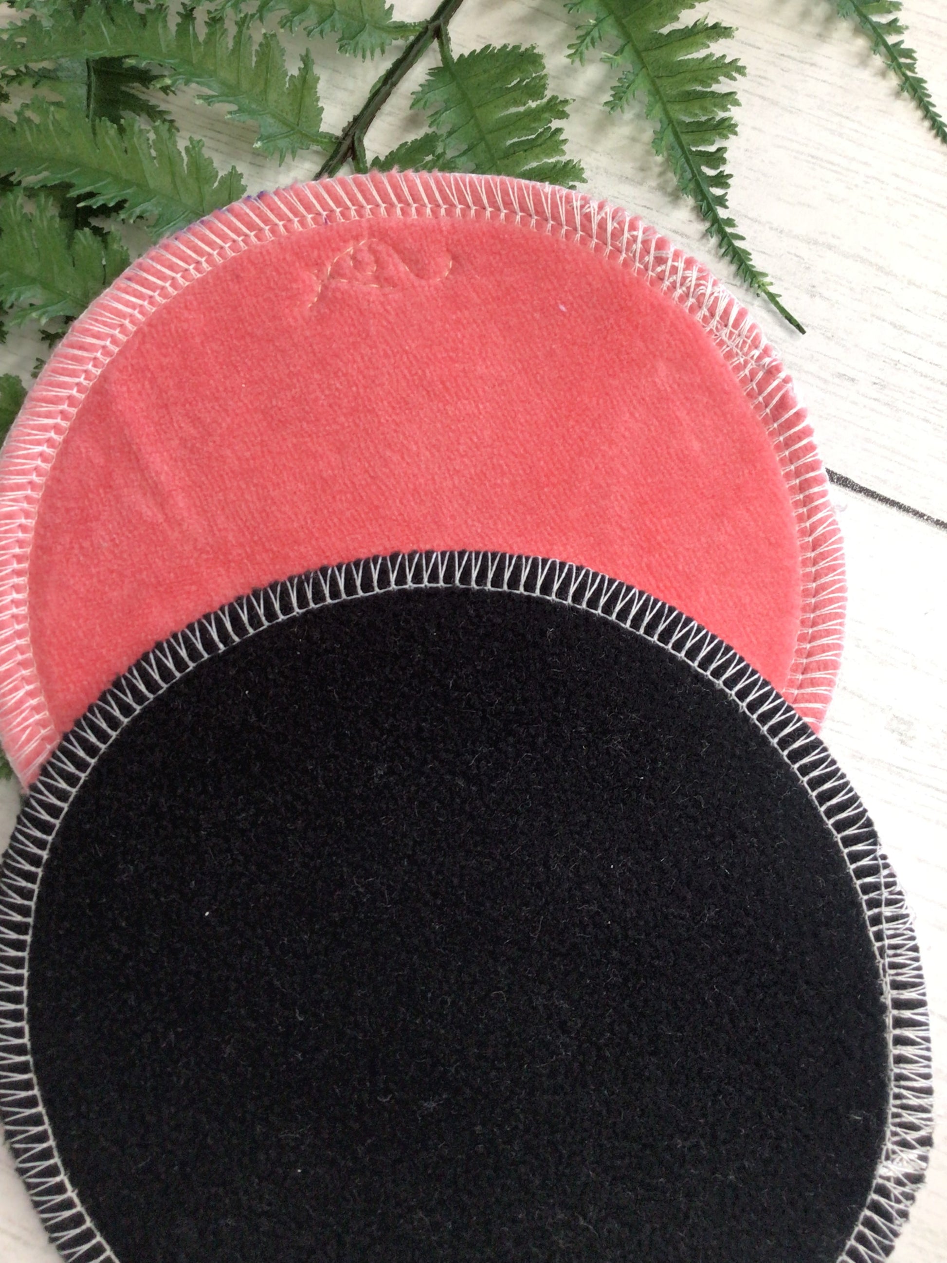 Organic Cotton velour topped nursing pads. Full coverage with a bamboo fleece absorbency core and a grippy black water resistant softshell fleece.